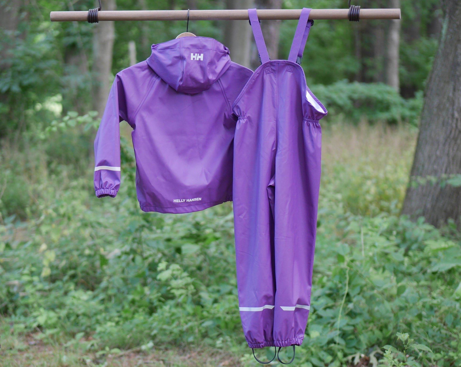 Helly Hansen's classic two-piece rain suit, in grapey purple.